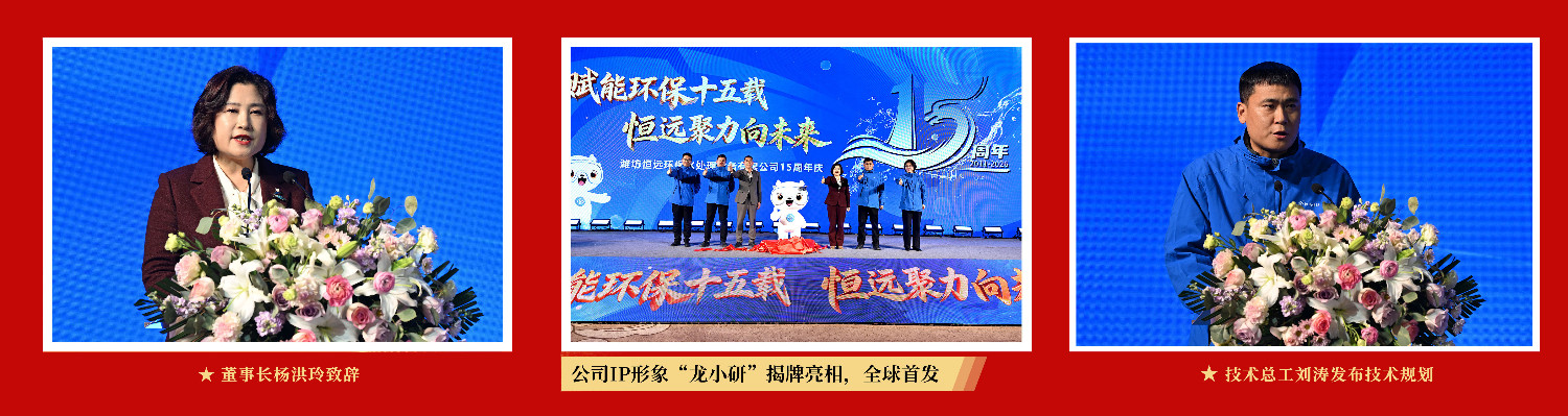傍晚,周年庆典晚宴温情启幕,各级领导、行业专家、合作伙伴、客户朋友及全体恒远人齐聚一堂,共同见证这一重要时刻。杨洪玲董事长发表致辞,回顾15年发展历程,分享恒远环保的初心与未来规划,字里行间满是坚守与期许,其规划部署为公司未来发展指明了方向,赢得现场热烈掌声。随后,现场举行恒远环保IP形象“龙小研”揭牌仪式,鲜活生动的IP形象传递出公司绿色发展的理念。紧接着,技术总工刘涛上台发布技术战略,详细阐述了公司在技术研发、产品迭代升级等方面的核心方向与实施路径,彰显了恒远环保以技术创新驱动高质量发展的决心。